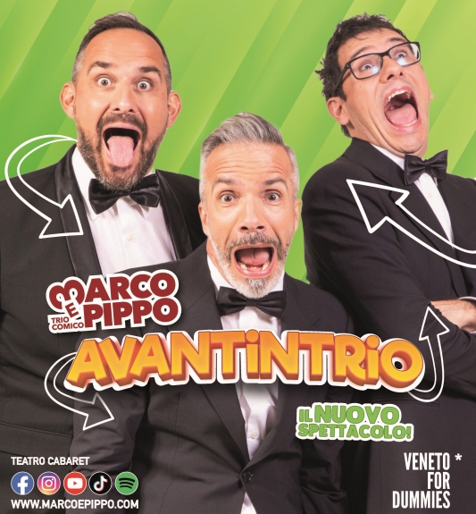 “AVANTINTRIO” è un gioco di parole che non solo rafforza ulteriormente l’identità di Marco e Pippo come un unico essere comico a tre teste, ma allo stesso tempo richiama e racconta il concetto di movimento.